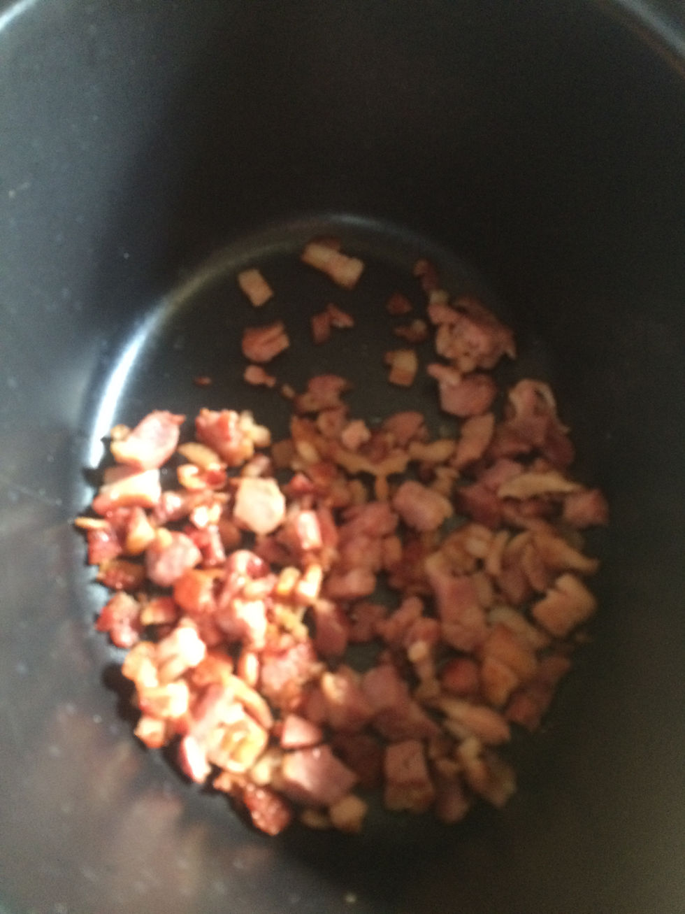 1) Put your slow cooker on high to warm up and a pan on the hob on high heat. Meanwhile fry the bacon on a high heat stirring regularly so it's evenly browned.